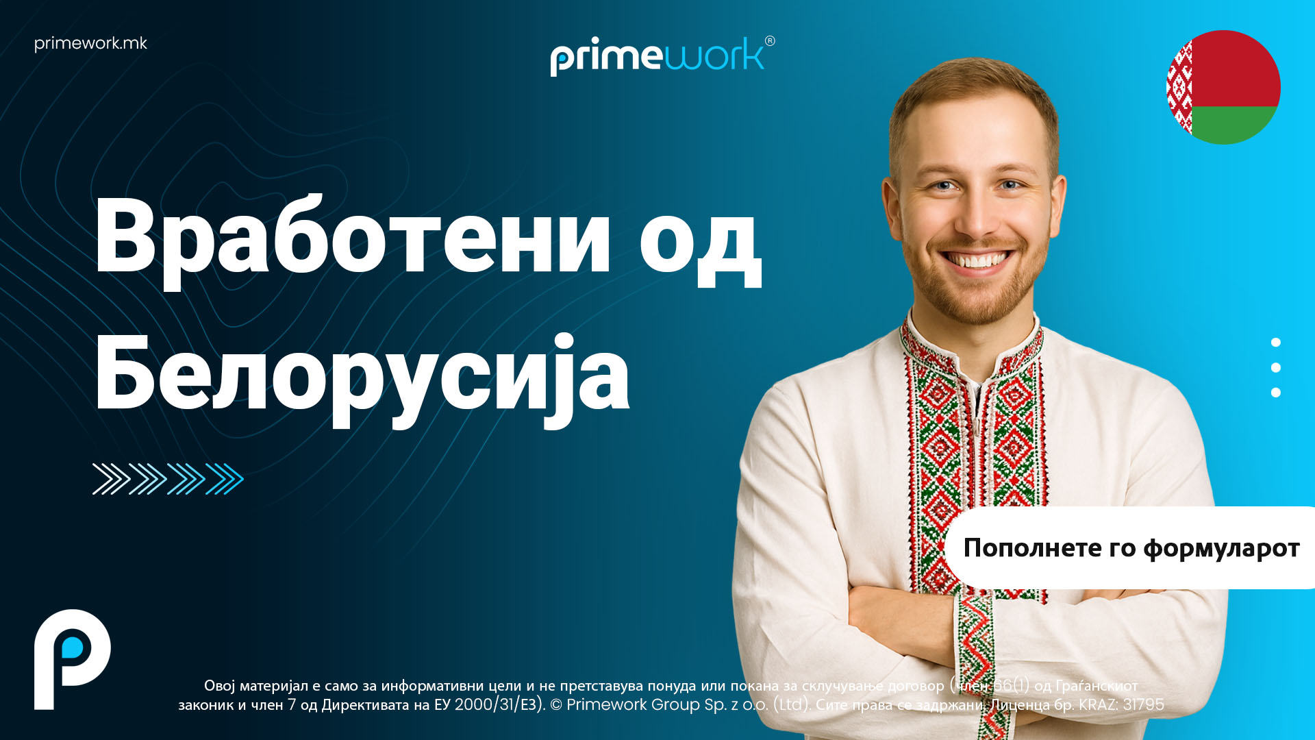 Вработувањето на работници од Белорусија претставува одлична можност за компаниите во Северна Македонија да ги пополнат празнините на пазарот на труд и да ги зајакнат своите човечки ресурси. Клучно е целиот процес да биде усогласен со важечките правни прописи и да ги зема предвид културните аспекти. Primework е подготвена да ги поддржи работодавачите во секоја фаза од овој процес, нудејќи професионални услуги за регрутација и советување.